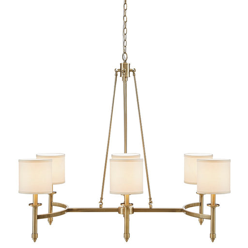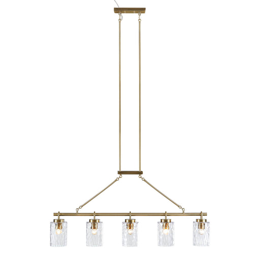 Transitional style chandelier with a modern touchFeatures a sleek antique brass finish for a luxurious lookComes with 5 textured glass cylindrical ...