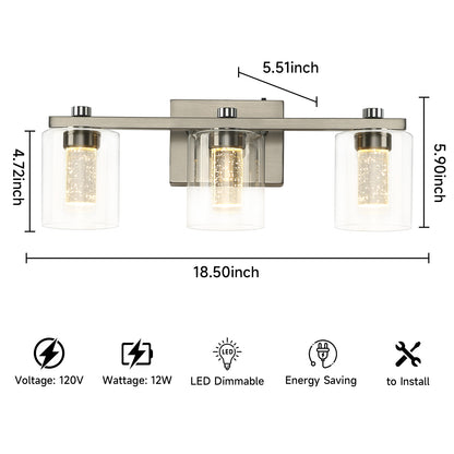 3-Light Bathroom Light Fixtures Crystal Brushed Nickel Over Mirror LED Vanity Lights Dimmable Wall Lamp