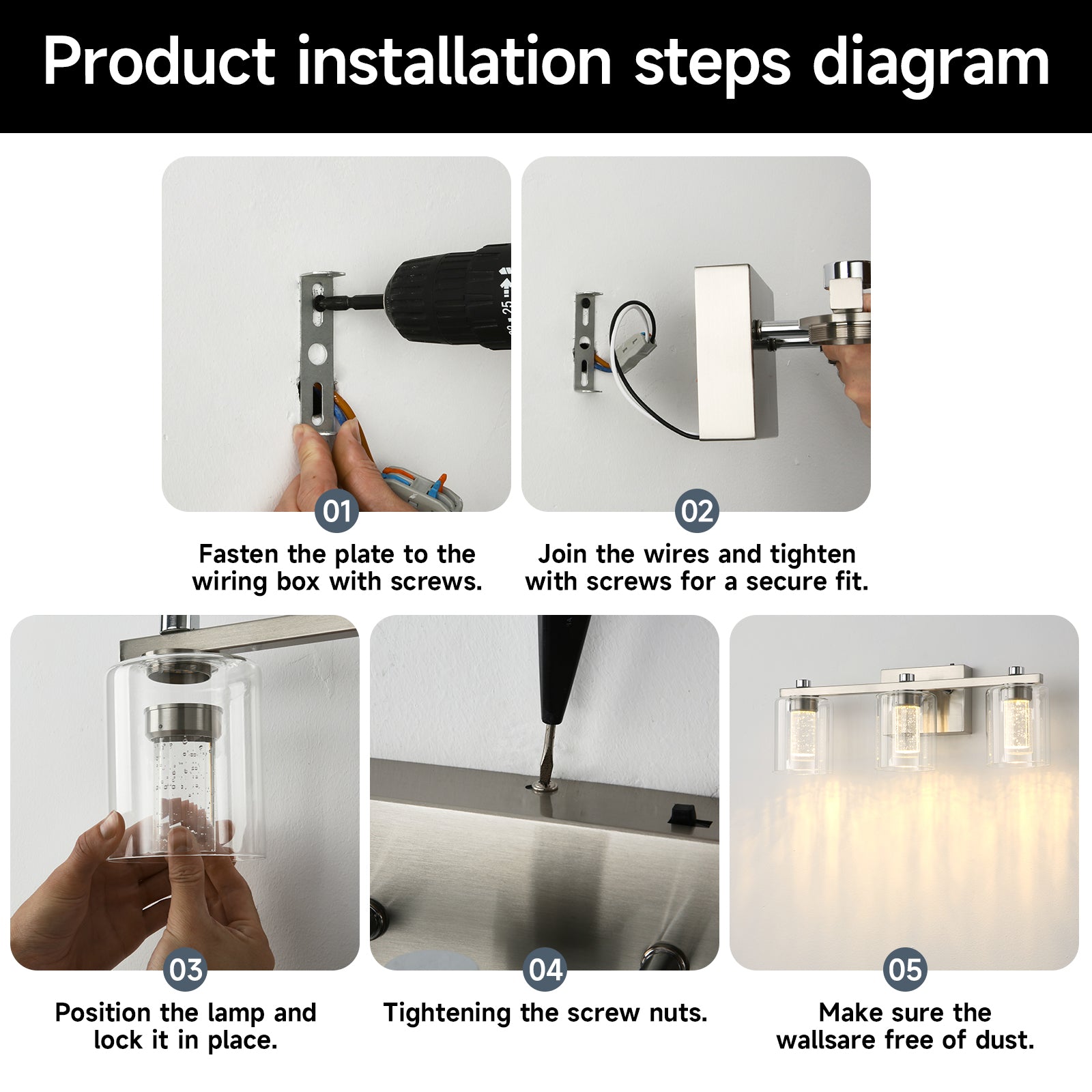 - GREAT CUSTOMER SERVICES: If you received the black vanity light with missing parts or broken glass shade, please do not hesitate to contact us, we will provide a satisfactory solution.