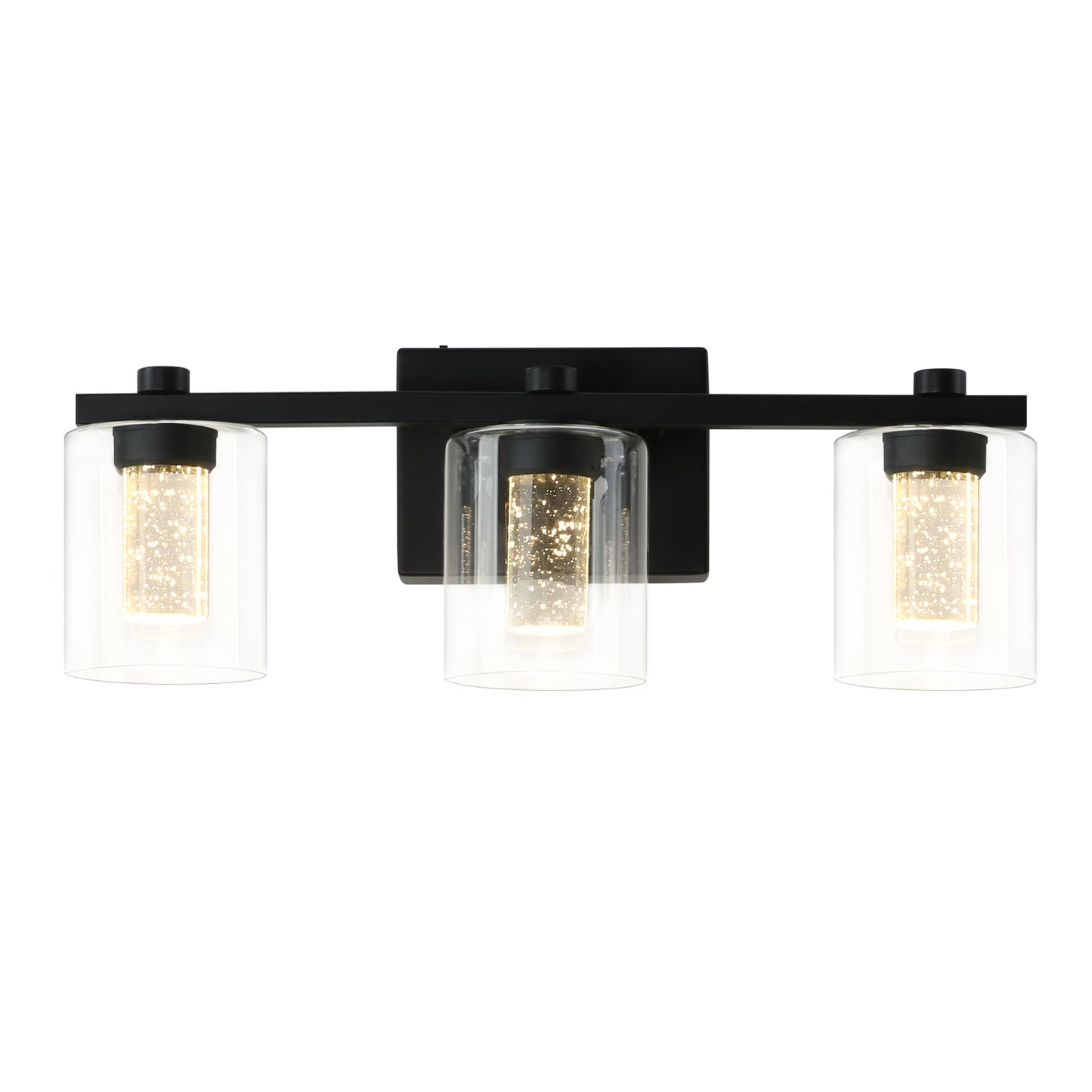 - MODERN DESIGH: SAND BLACK & CRYSTAL LAMP POST GLASS SHADE: 3-light vanity light boasts a stylish sand black finish on a durable metal base, The uniquely designed hardware frame enhances the three-dimensional and layered sense of the lamp. What's more, it features high-quality crystal lamp post & clear glass shades that disperse light throughout your room, creating an all-encompassing illumination.