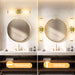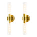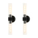 Set of 2 black and gold wall sconces featuring durable aluminum construction and clear glass shades. Each fixture accommodates two E26 bulbs (max 60W each) and supports incandescent, LED, fluorescent, and dimmable options. Hardwired installation connects to standard 110V-120V power with included mounting hardware. Versatile design suits bathrooms, bedrooms, living rooms, and commercial spaces. Modern aesthetic combines functionality with contemporary style. Backed by 12-month warranty.
